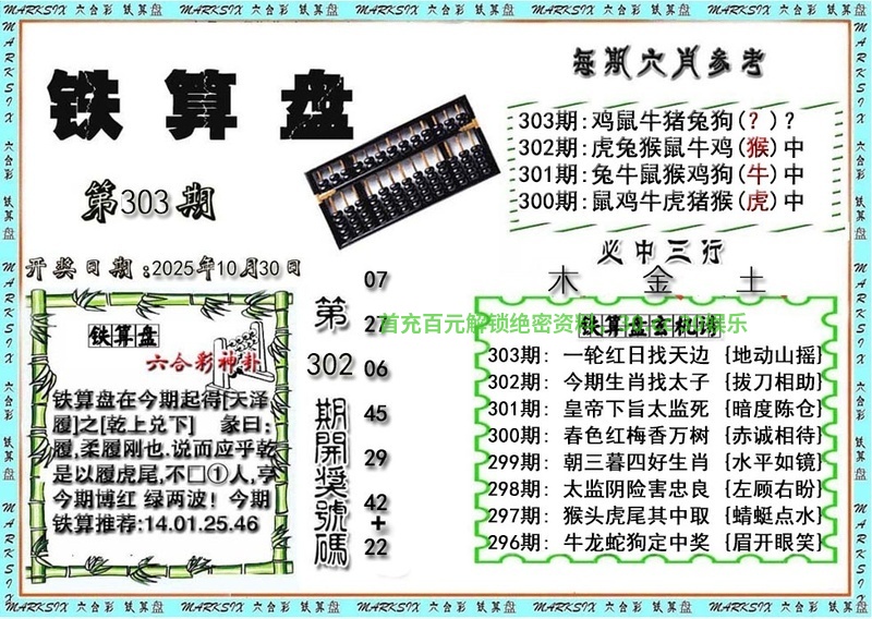| 303期精解铁算盘玄机:一轮红日找天边{地动山摇} 玄机解释:一轮红日,日肖兔龙蛇马羊猴 综合取肖:兔龙蛇马羊猴 主取号码:15.27.02.14.13.36.23.22  |